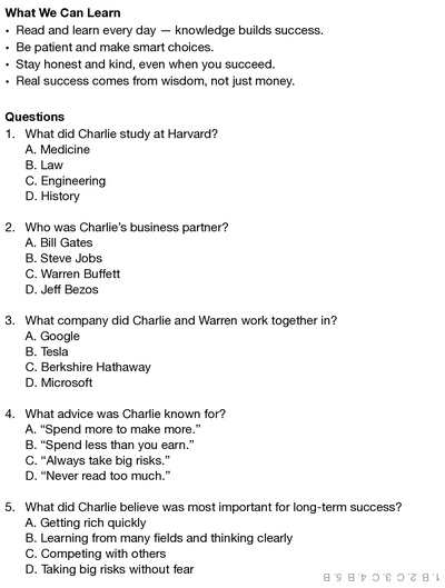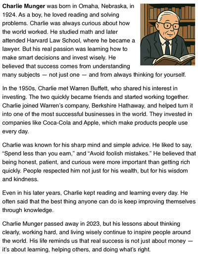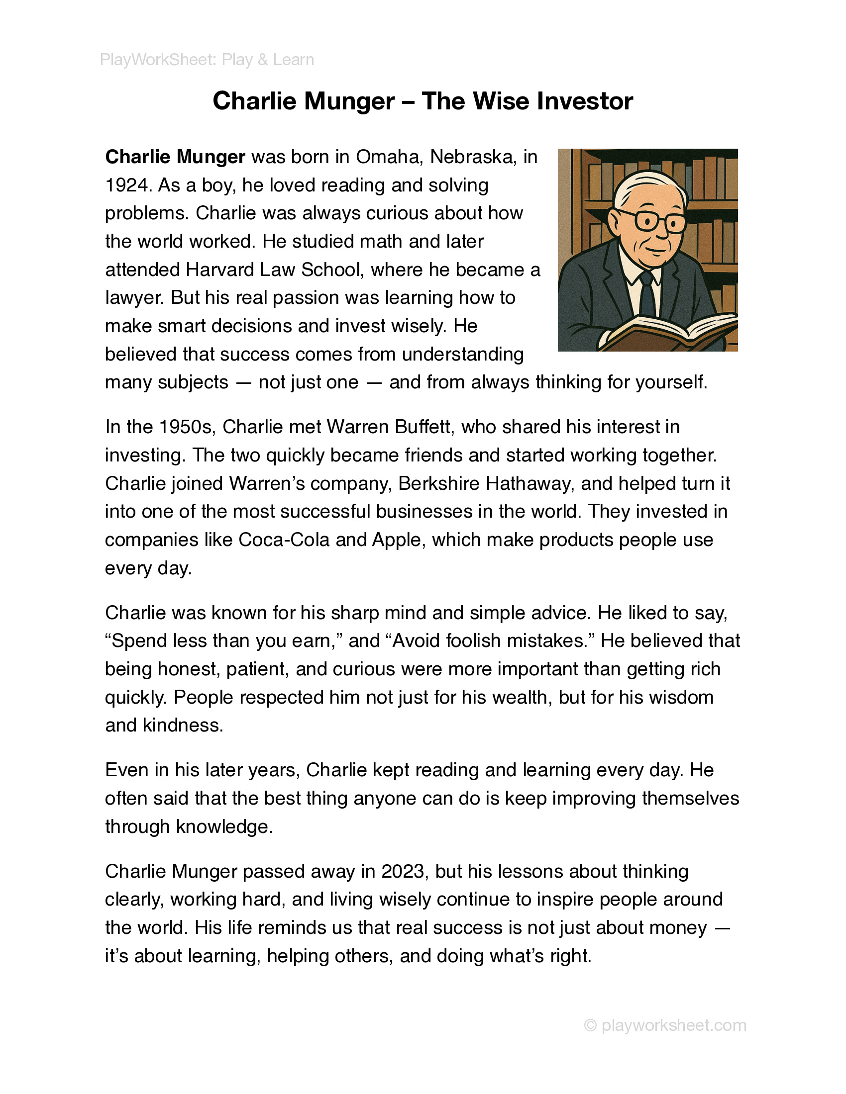 This printout is a learning worksheet about Charlie Munger, made for students who want to learn about smart thinkers and business leaders. It tells the story of how Charlie Munger grew up in Omaha, Nebraska, and showed curiosity and strong thinking skills from a young age. He loved reading, solving problems, and learning about how people make decisions. After serving in the U.S. Army during World War II, he studied law at Harvard University and became known for his sharp mind and honest character.
