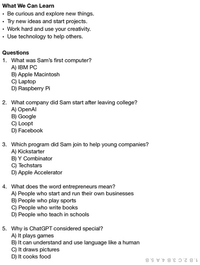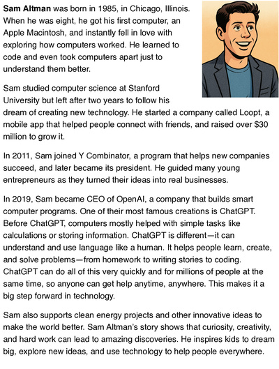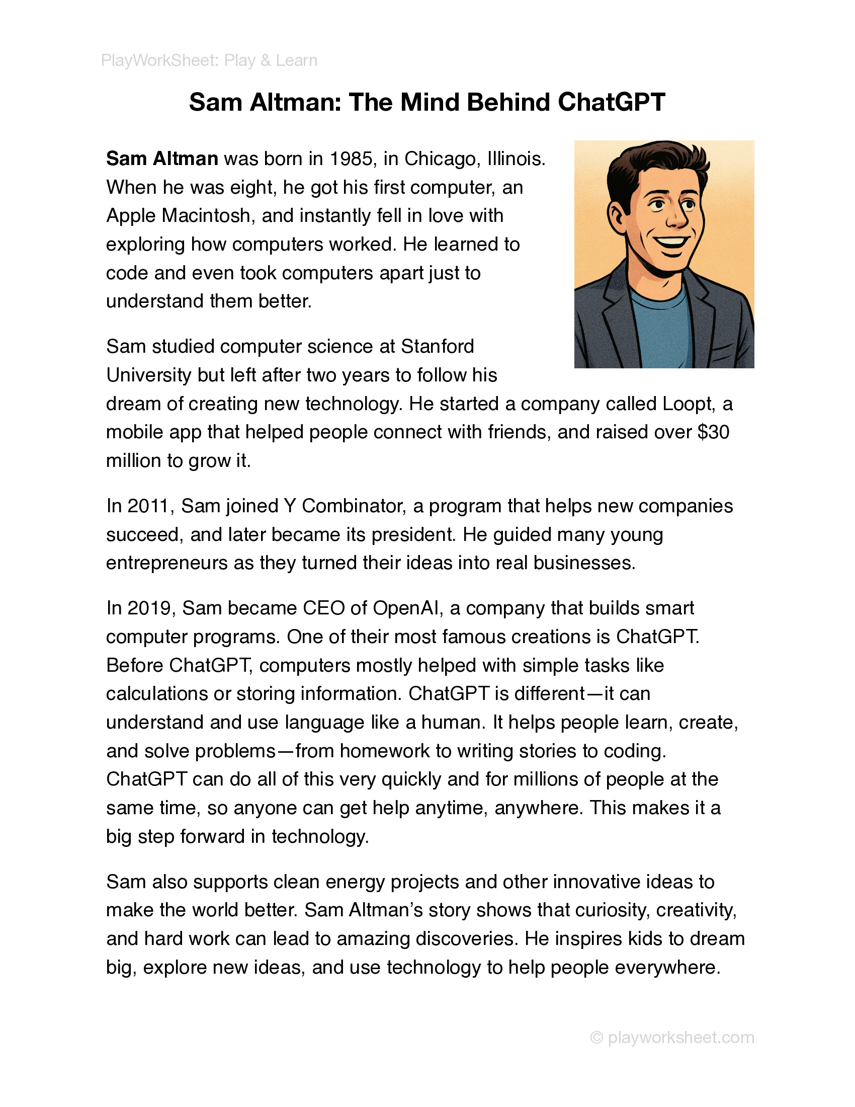 This printout is a learning worksheet about Sam Altman – The Mind Behind ChatGPT, made for students who want to learn about inventors and innovators who change the world. It tells the story of how Sam Altman grew up in the United States and showed curiosity and interest in technology from an early age. He loved exploring computers, programming, and new ideas, learning how technology could solve big problems. Later, he studied computer science and entrepreneurship, preparing himself to turn his ideas into real inventions.
