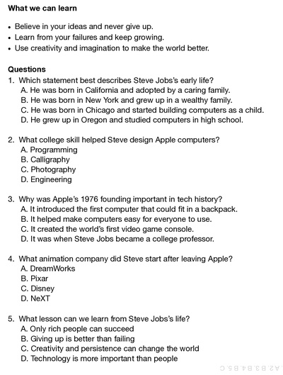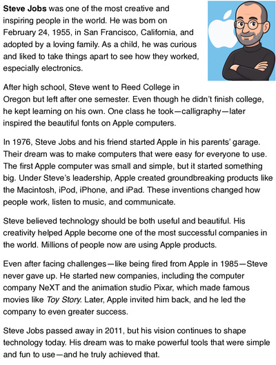 This printout is a learning worksheet about Steve Jobs – The Man Who Changed Technology, made for students who want to learn about inventors and innovators who change the world. It tells the story of how Steve Jobs grew up in California and showed curiosity and creativity from an early age. He loved electronics, design, and building things, always thinking about how technology could be simpler and better. Later, he studied electronics and design, preparing himself to turn his ideas into real inventions.