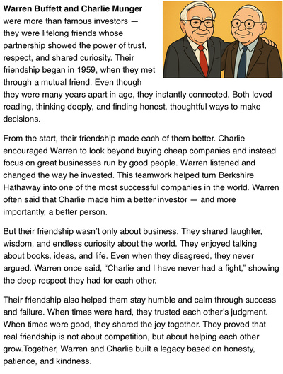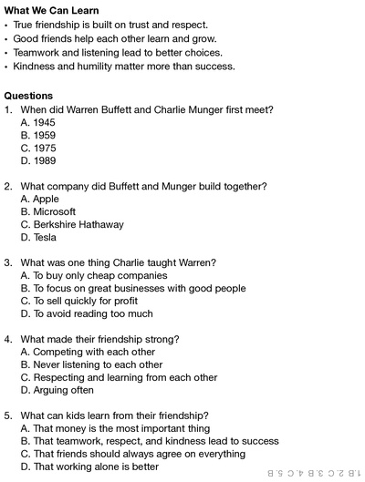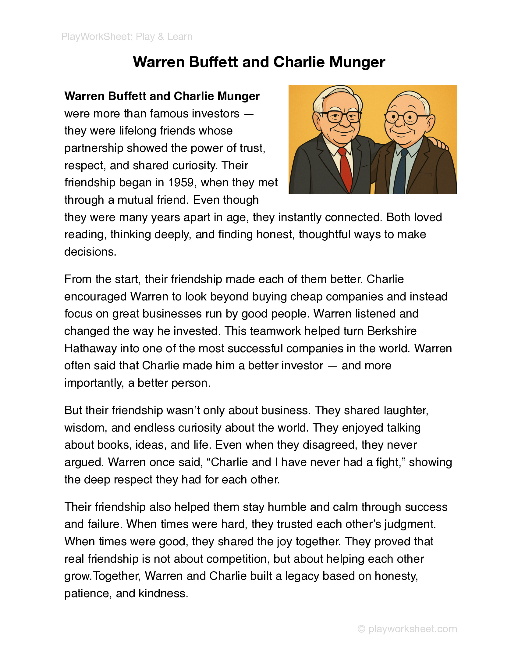 This printout is a learning worksheet about Warren Buffett and Charlie Munger – The Greatest Investing Team, made for students who want to learn about people who use their skills to make a difference. It tells the story of how Warren Buffett grew up in Nebraska and Charlie Munger grew up in Ohio, and how both showed an interest in money, business, and learning from a young age. They loved reading, solving problems, and understanding how companies work.