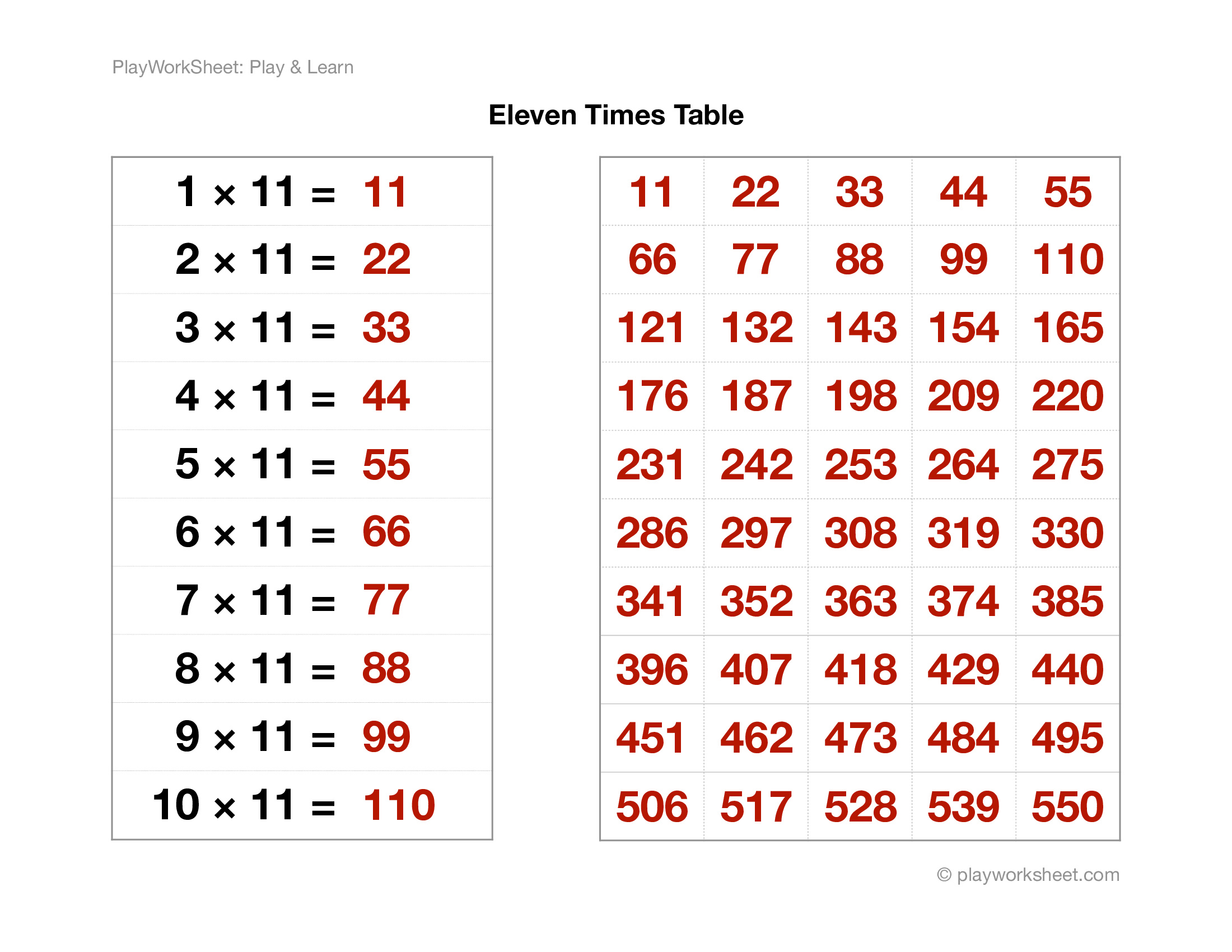 This colorful and structured worksheet displays the eleven times table, showcasing the multiplication of 11 from 1 * 11 to 10 * 11, providing an easy-to-follow guide for learning the multiples of 11. Additionally, it features a comprehensive list of multiples of 11 up to 550, offering an extended view of the pattern created by these multiples.