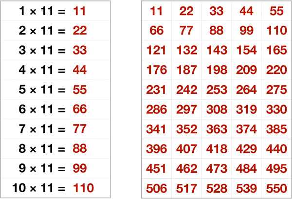 This is a printable page showcasing the eleven times table, spanning from 1 * 11 to 10 * 11, and displaying multiples of 11 up to 550. This page serves as an invaluable tool to aid children in learning multiplication and discovering fascinating patterns within the multiples of 11.